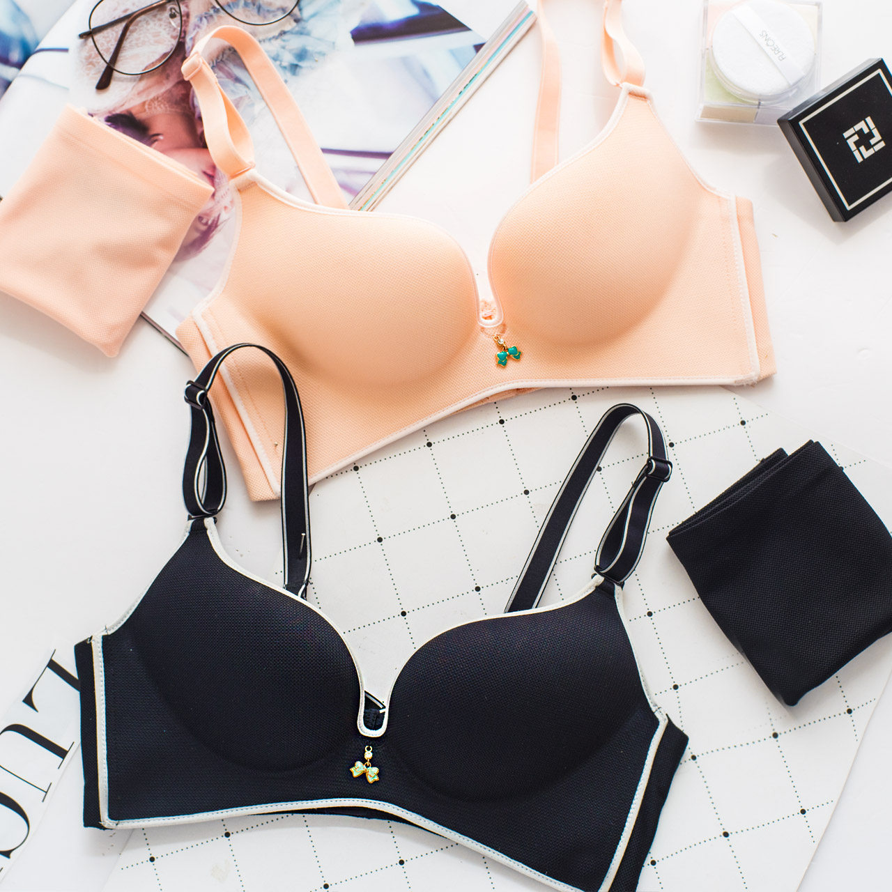 企蔻欧美简约小胸无钢圈薄款聚拢文胸细带性感女三角杯内衣套装